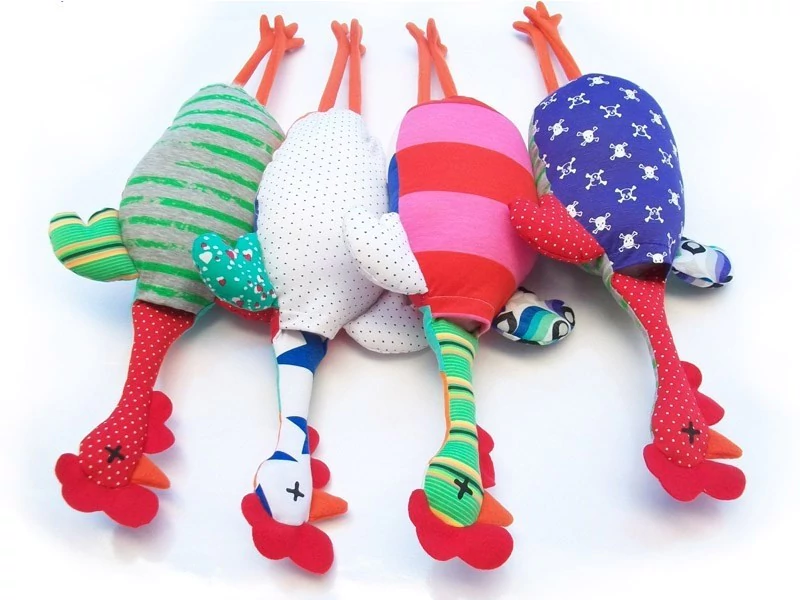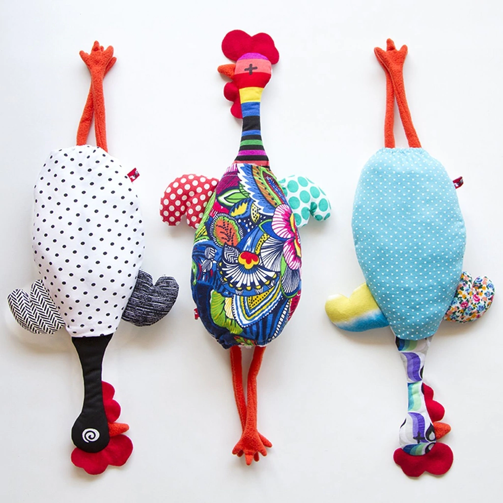 Divertido contenedor de bolsas en forma de gallina. Se colocan las bolsas en la parte superior, y se van sacando por el pescuezo de la gallina! De colores y texturas variadas.