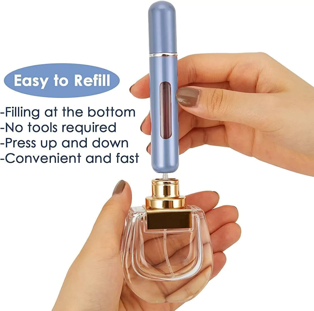¡Lleva tu fragancia favorita contigo en cada viaje con nuestra mini botellita de perfume recargable! Cuando viajamos, siempre buscamos la forma de llevar lo esencial sin cargar con un equipaje voluminoso. Nuestro práctico MINI ATOMIZADOR es imprescindible para los viajeros que valoran la practicidad y no quieren renunciar a nada. Su funcionamiento es sencillo: simplemente llena la botellita directamente desde tu perfume original y ¡listo! Disfruta de tu fragancia preferida en todos tus viajes. Su diseño elegante y su portabilidad aseguran que nunca lo dejes en casa. Este atomizador de perfume práctico tiene una capacidad de 5 ml, perfecto para viajes. Recuerda, los perfumes mejoran la confianza, ¡y es esencial para el éxito personal! ¡Siéntete bien y huele a tu perfume favorito en todo momento!